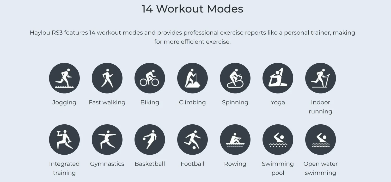 It supports 14 sports modes, including jogging, fast walking, biking, climbing, spinning, yoga, and more.